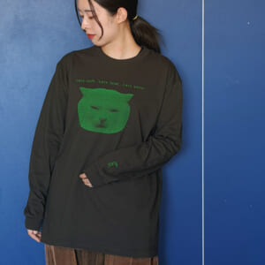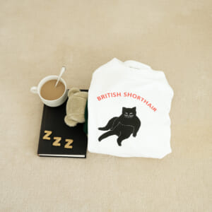 「CAT HOPE, CAT THINK, CAT KNOW」暗闇にぼんやりと浮かび上がる、看板猫・ひなたのTシャツ。
