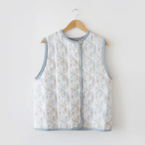 「森の湖」刺繍のベスト。中綿が入っていてあたたかいベストです。陶のボタン付き。