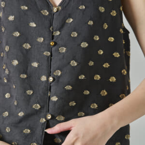 「ラメダイヤ植物染ノースリーブブラウス」植物染のチャコールグレーとラメ糸のコントラストがかっこいい後ろ前どちらでも着られるトップス。