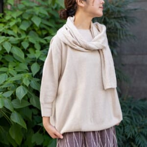 「ウールコットンニット」原綿から草木染めした綿糸とウールの混紡糸を使用し、継ぎ目縫い目がなく、肌当たりが優しい無縫製ホールガーメントで編み上げたニットです。