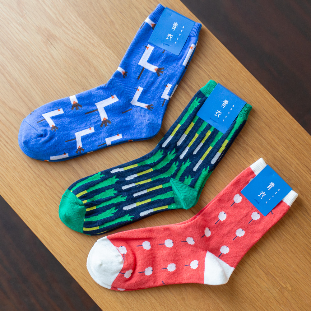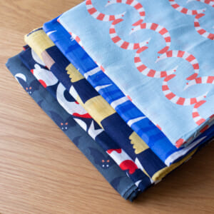 日本で、京都で、自分たちが何気なく見ている風景から集めた「こんな柄があったら楽しいな」をカタチにしています。“ニッポンの絵柄”をモチーフにした「新しいニッポンのテキスタイル」をコンセプトに、すべてのテキスタイルを京都で染色。テキスタイルの絵柄は、富士山、錦鯉、りんご飴、とんびに油揚げ、九条ねぎ、杜若といった日本らしいモチーフです。京都という土地柄を大切に、従来のイメージを心地よく裏切る、ポップでカラフルな新しいテキスタイルを目指しています。 “心地よい素材と、心地よい配色”で作る新しいニッポンのテキスタイル「青衣 あをごろも」。メイド・イン・京都から。