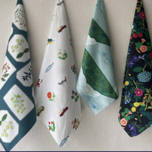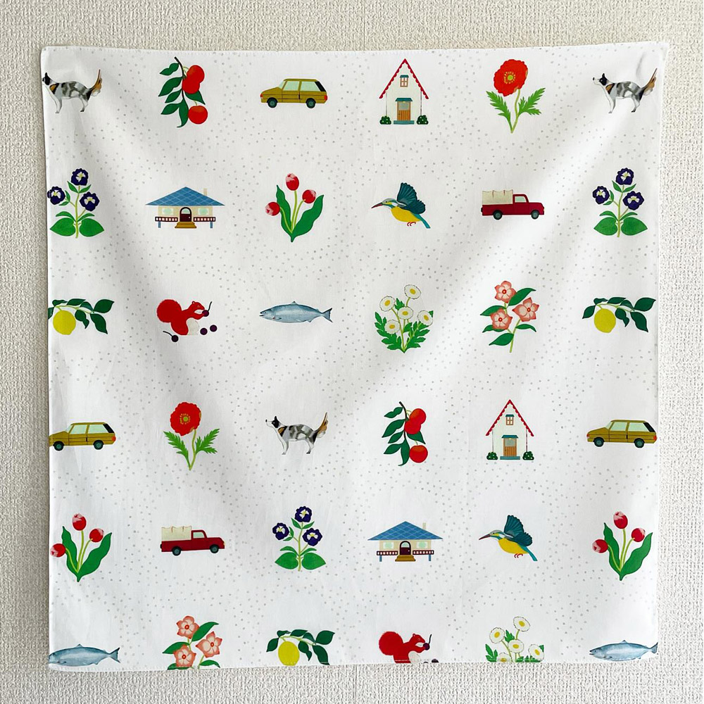 絵を持ち歩くような、様々な形と絵柄のハンカチ。最近ではダブルガーゼ素材でもご用意しています。