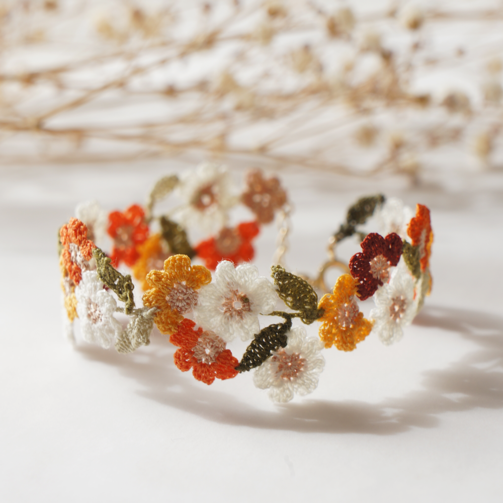「コスモスの耳飾り」。花びら一つひとつ丁寧に編み込んだかぎ針編みの耳飾りです。色鮮やかな花束が顔まわりを明るくしてくれます。コーディネートのワンポイントにもおすすめです。