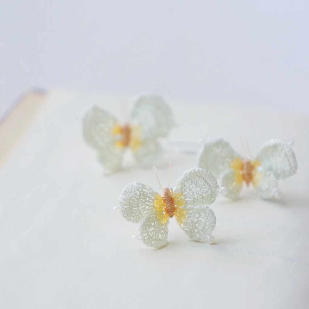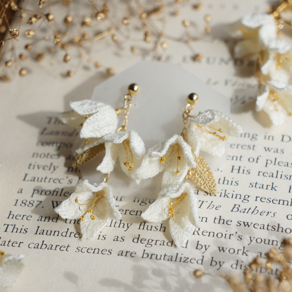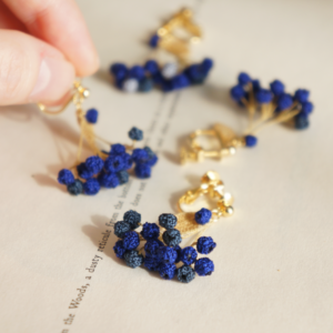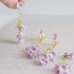 「金木犀のイヤカフ」。とても小粒なお花を細い糸で丁寧に編みました。たっぷりの小さな花粒は耳元をさりげなく彩ってくれます。片耳タイプです。