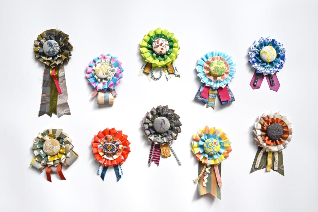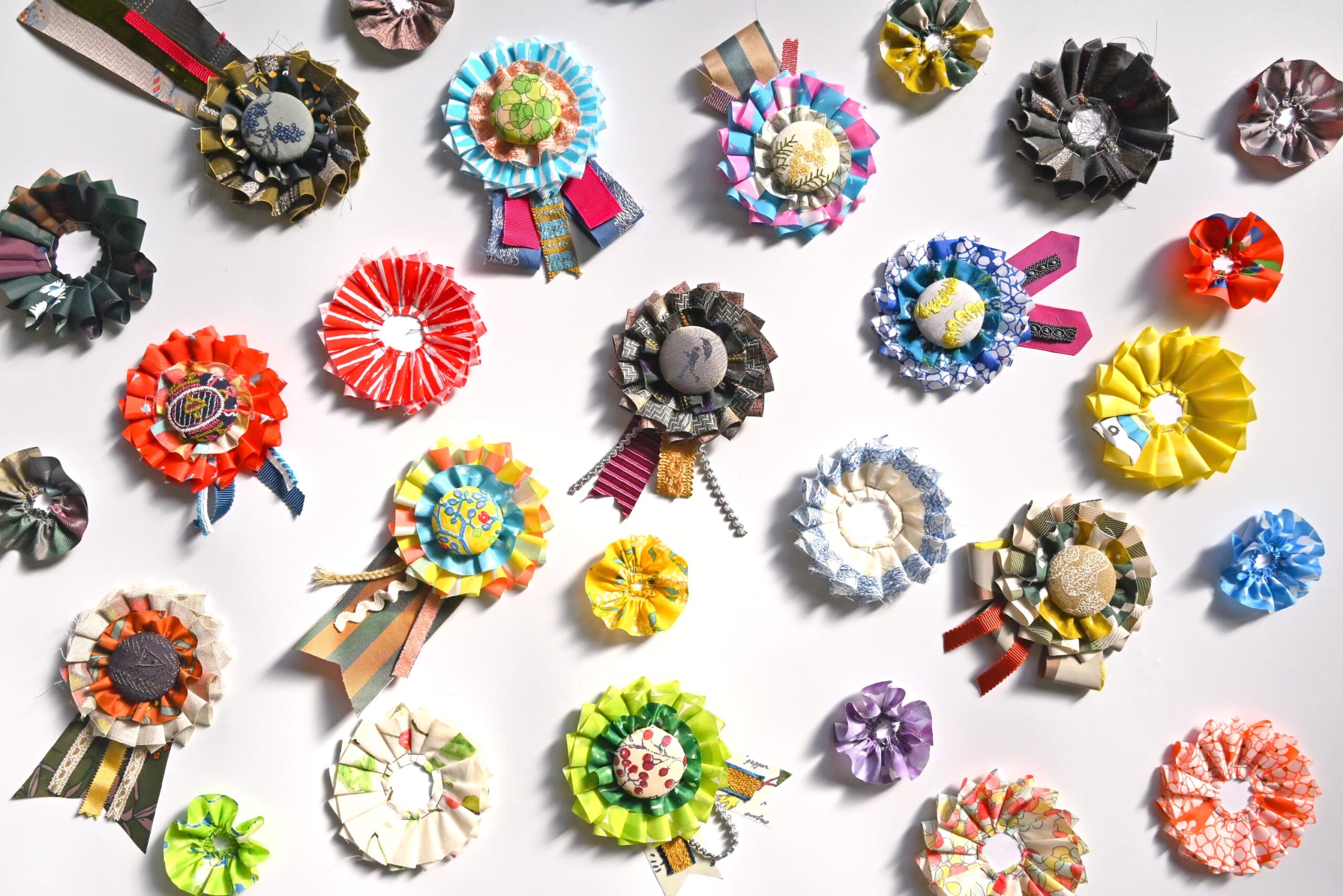 「イイダ傘店」のテキスタイルを用いたパーツをたくさんご用意しました。くるみボタンやリボンなどパーツの組み合わせ次第で、かわいらしくまとめたり、大人っぽく仕上げたり……。自由な組み合わせで、自分だけのロゼットブローチ作りをお楽しみください。