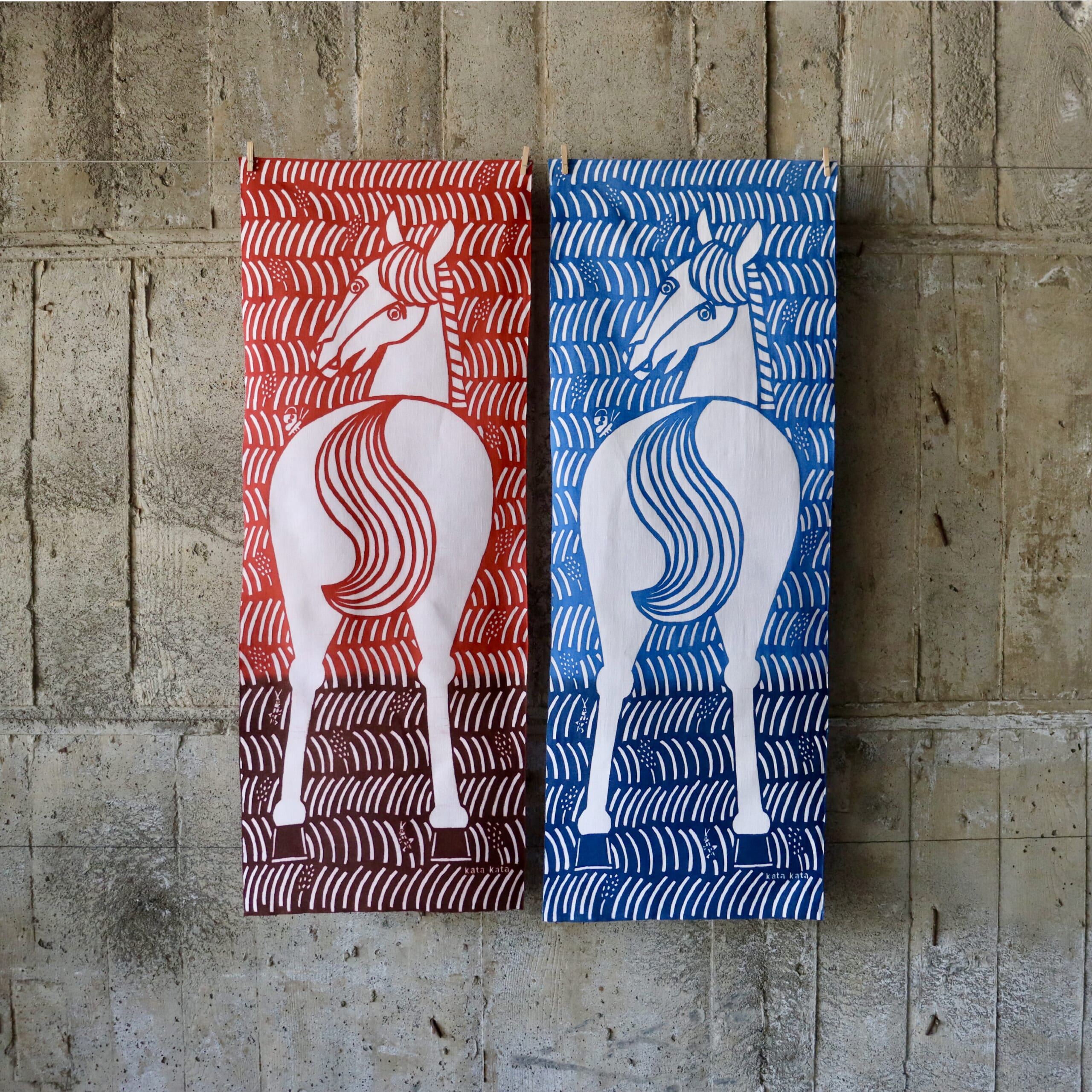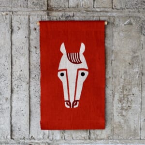 毎年制作している干支の手ぬぐいです。チラリとこちらをふりむく馬の手ぬぐいです。