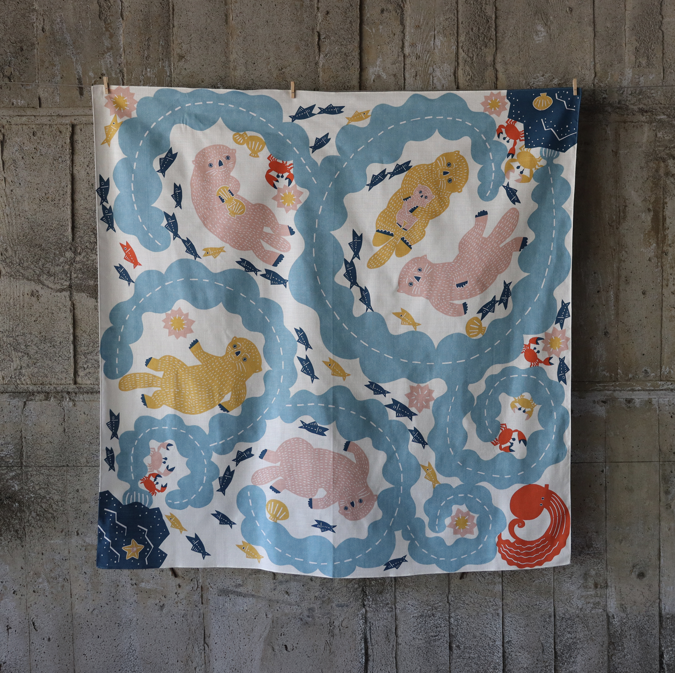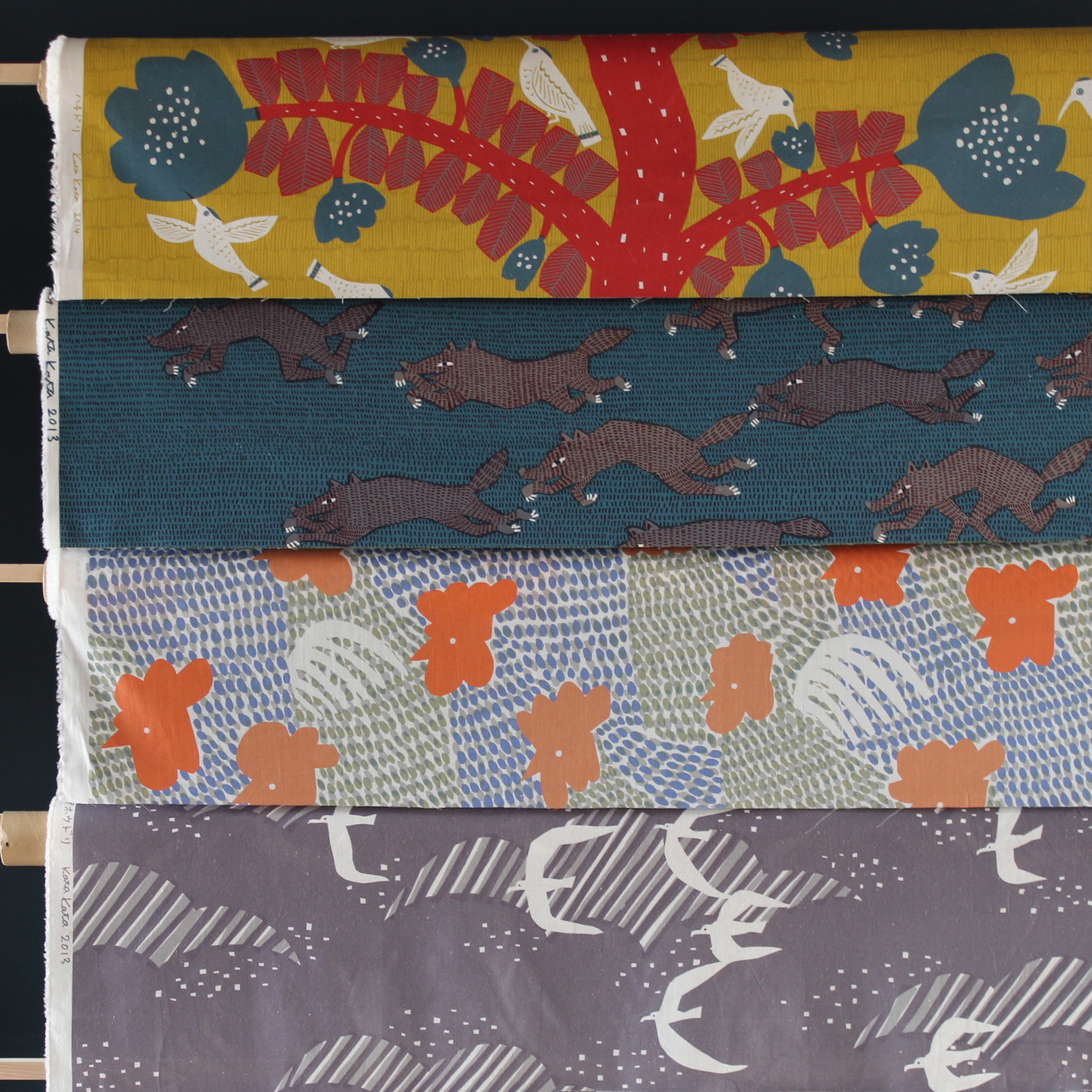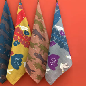 kata kataの看板作品は、注染で染めたオリジナル柄の手ぬぐいです。職人の手仕事による色のにじみと、いきものをモチーフに物語性あるデザインが特徴です。