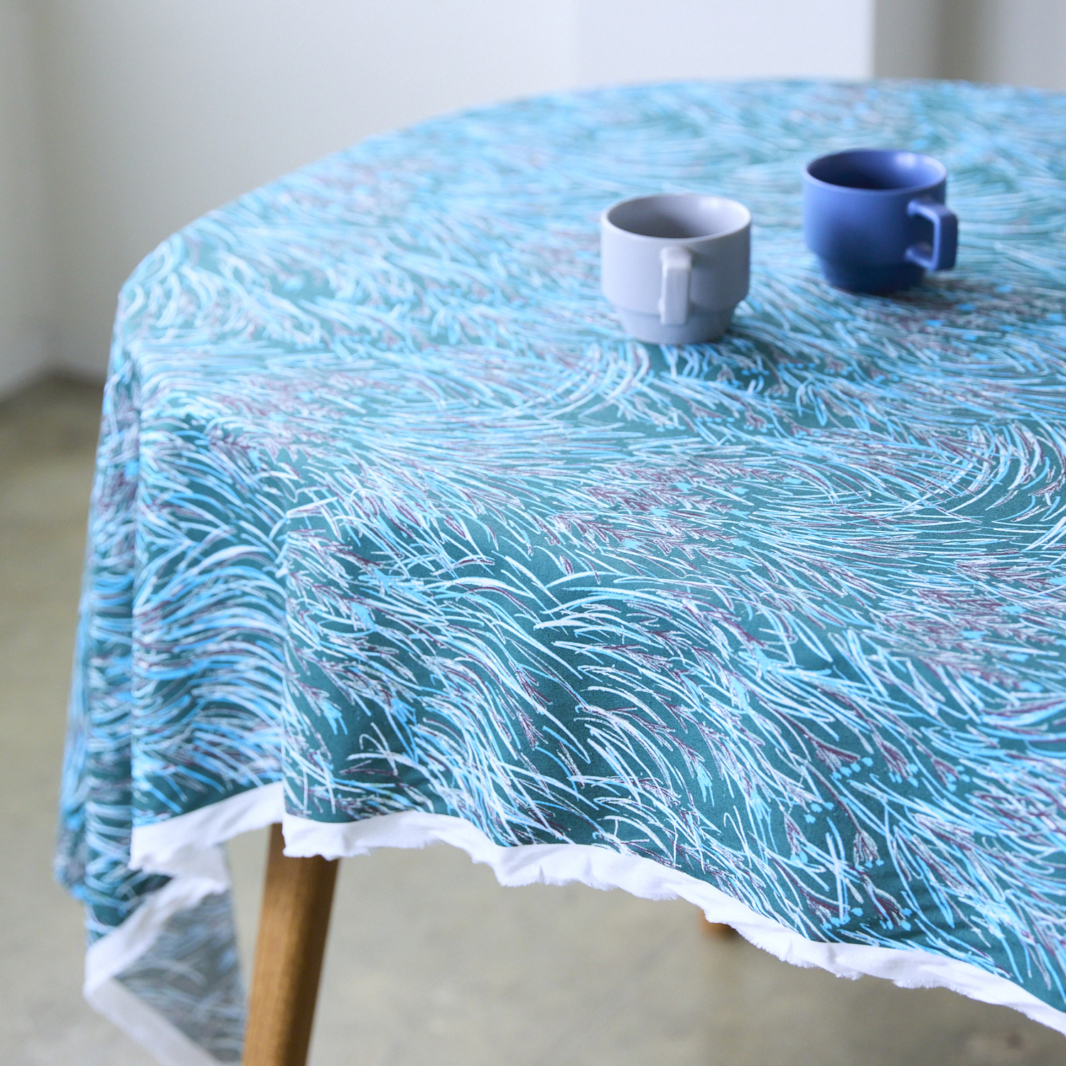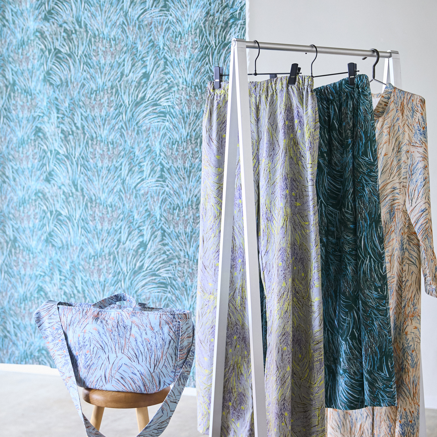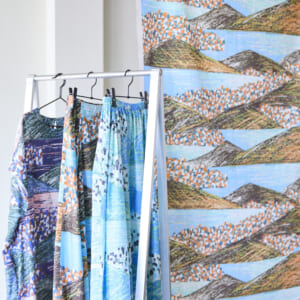 風景モチーフのプリントテキスタルです。デザイナーが見た風景を模様に落とし込み、みな様に共有できたらという思いで描いています。ぜひ売り場でたくさん広げてみてください。