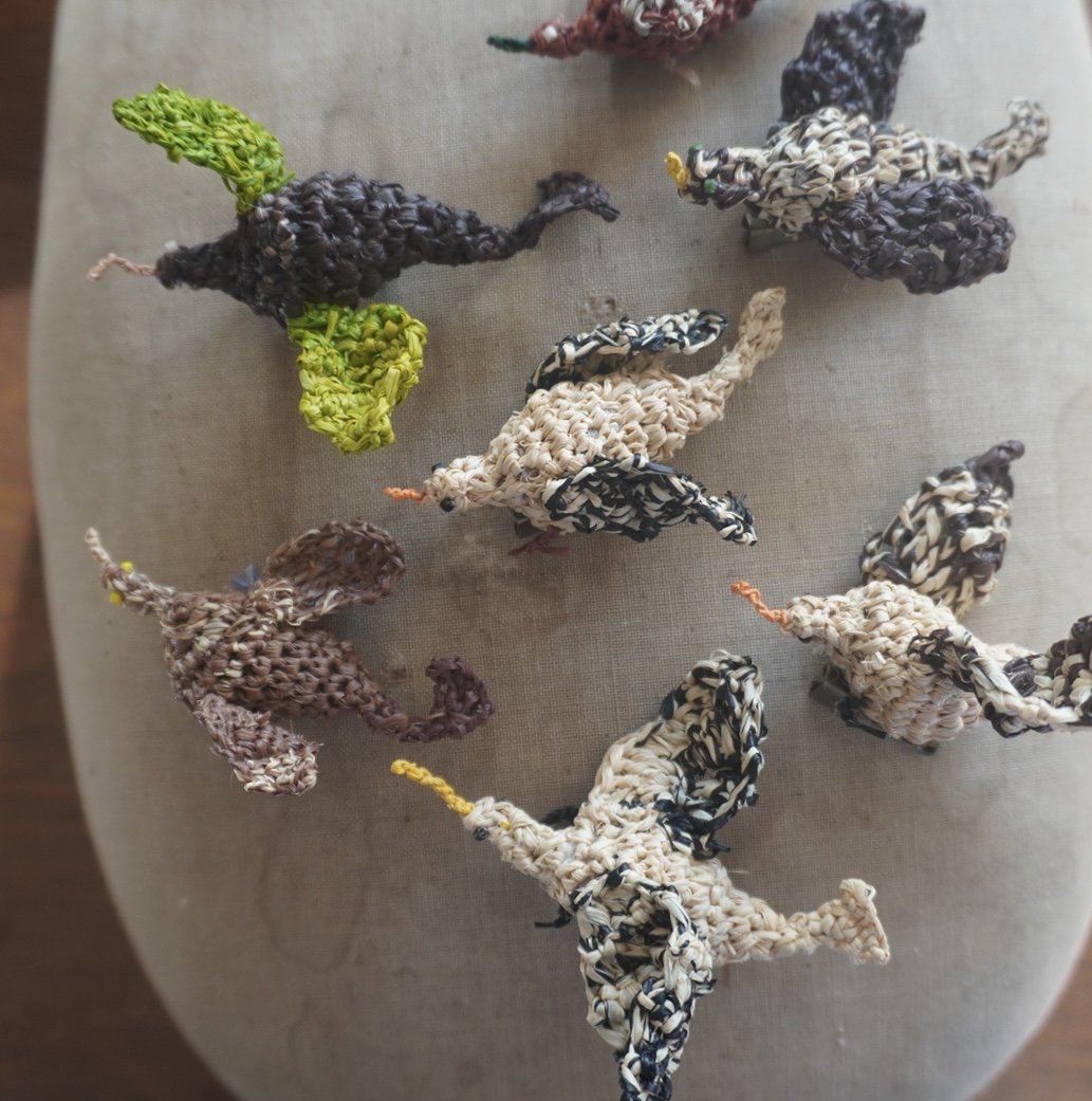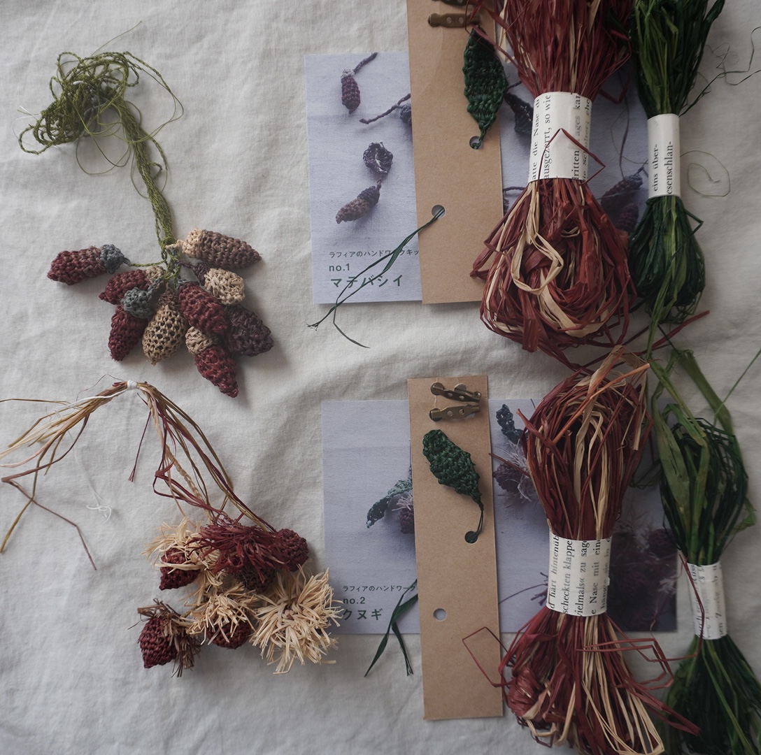 軽やかなラフィアの質感を活かしたアクセサリーを制作中です。