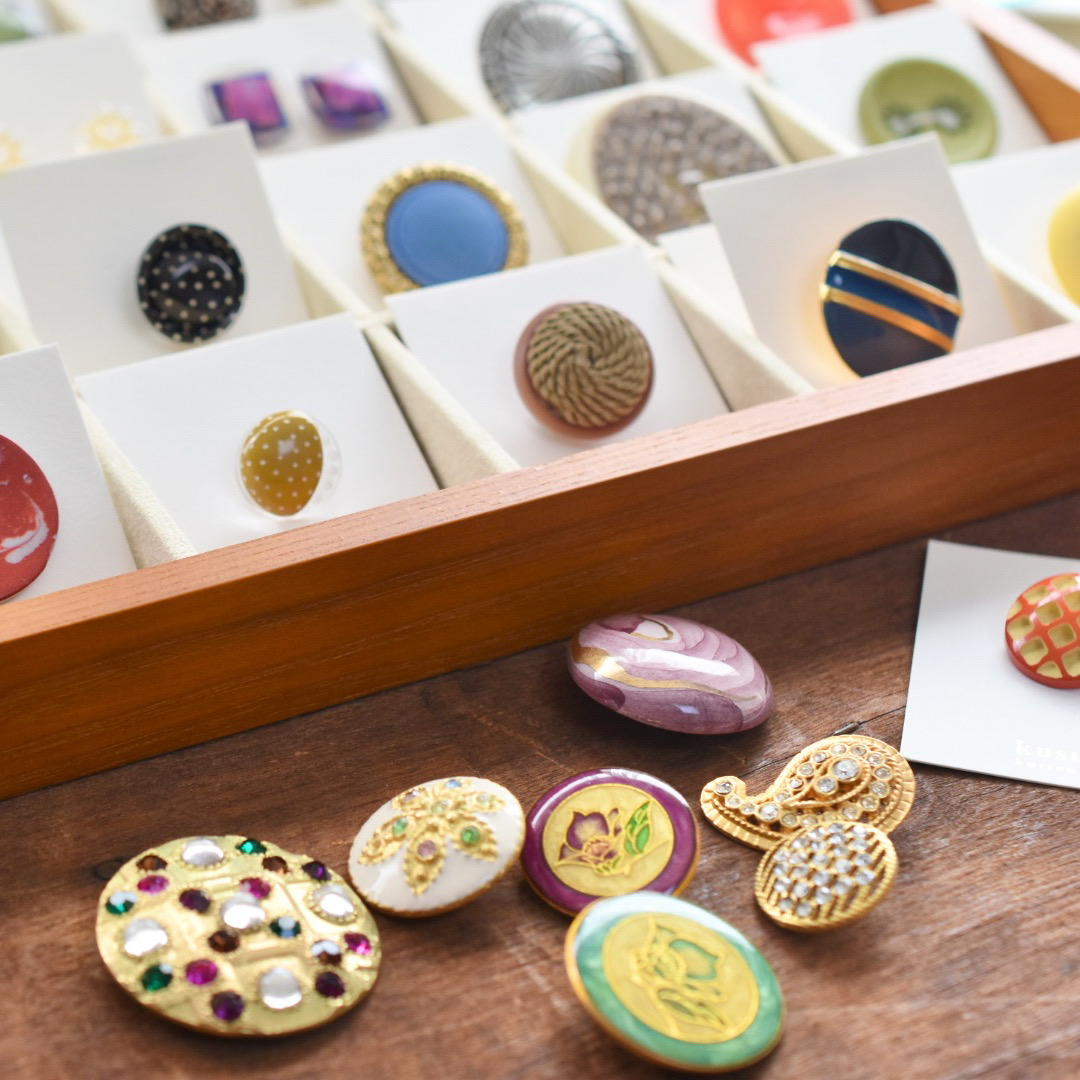 「ヴィンテージペアボタン」。アクセサリーにおすすめのボタンをペアセットにしました。“もっと気軽にボタンを楽しんでほしい”という想いから生まれたシリーズです。オーダーでピアス・イヤリング、リングへの加工も承りますので、お気軽にお声がけください。
