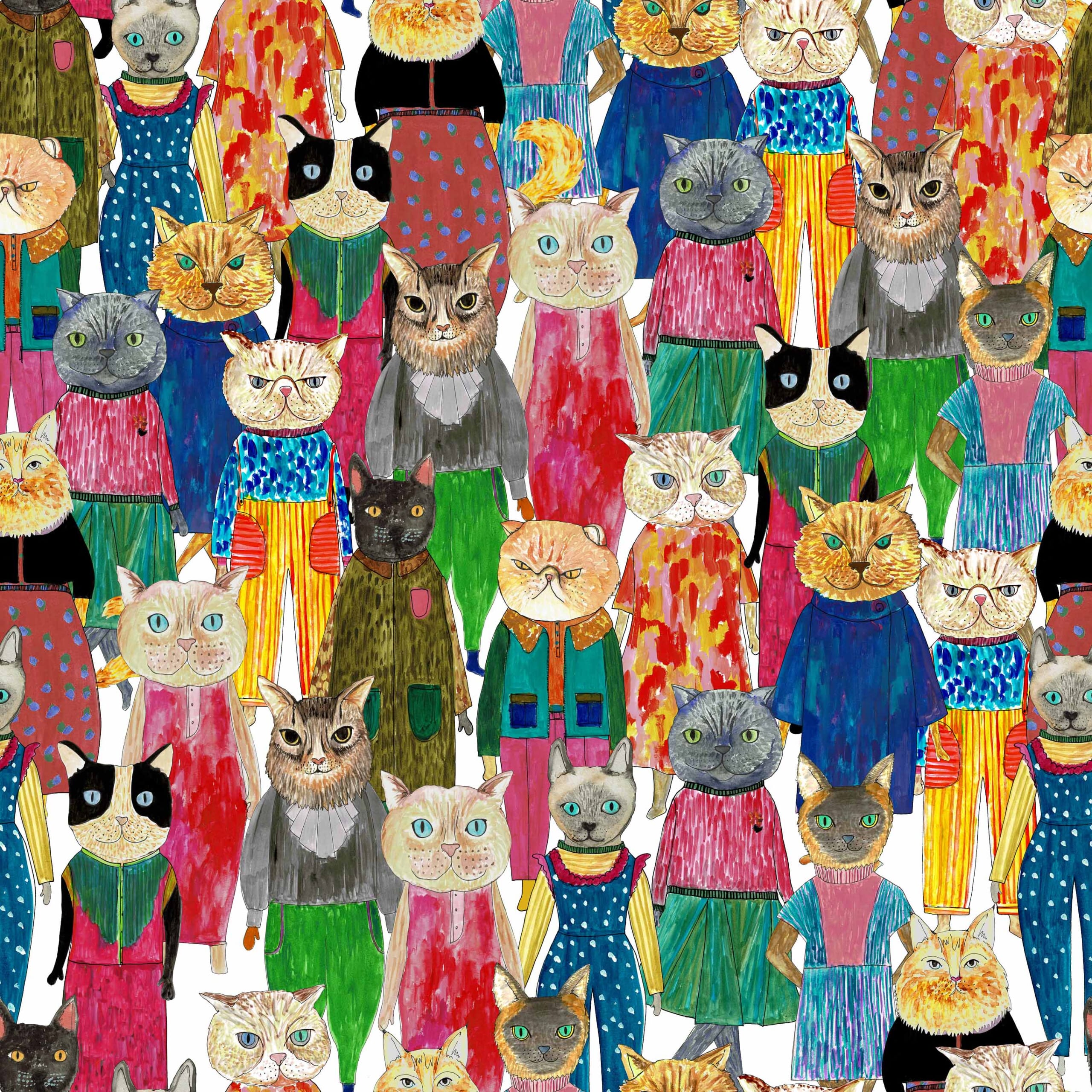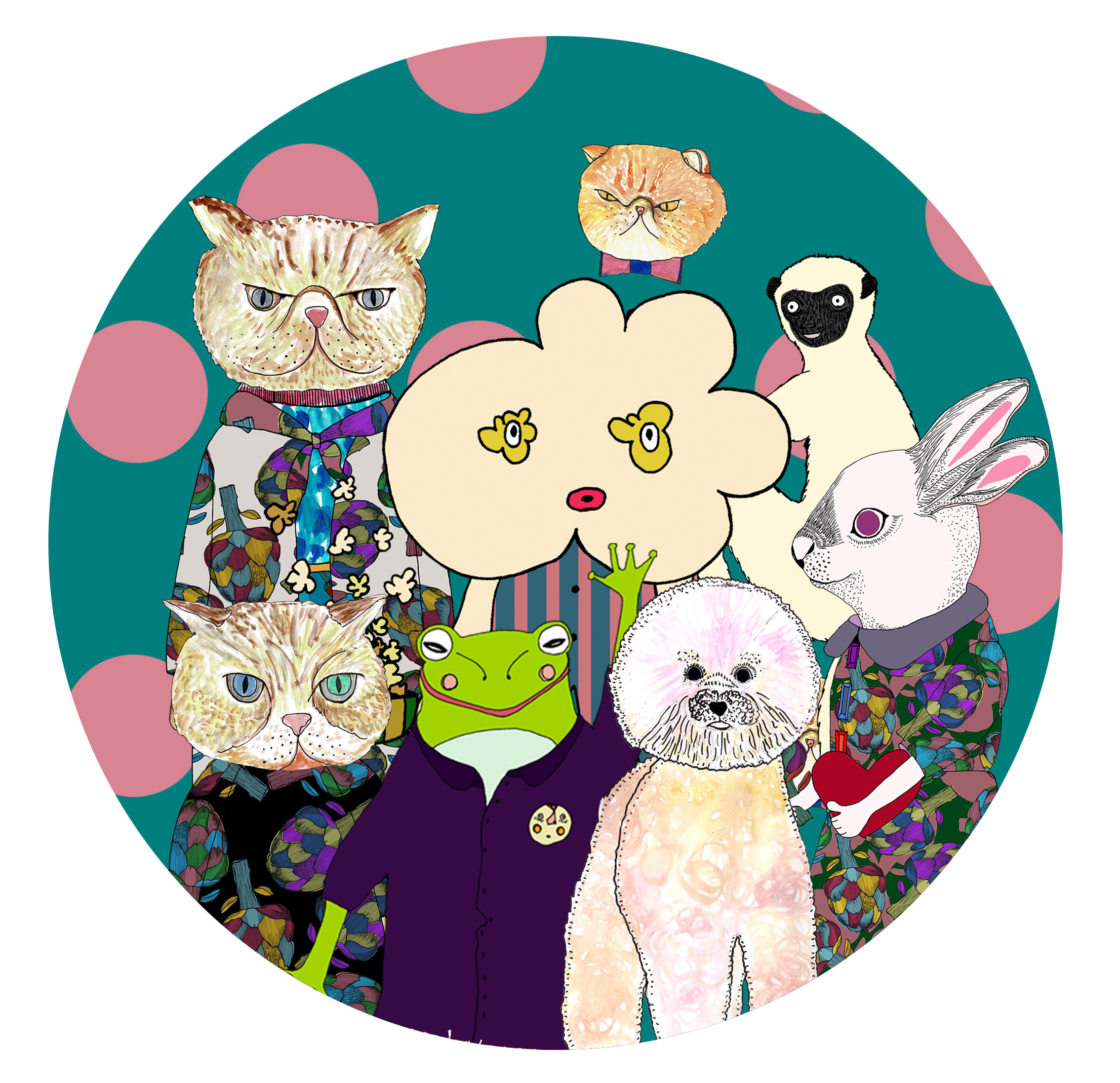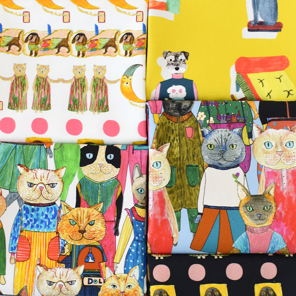 猫や犬、パンダ、カエルなど愉快な仲間が集うテキスタイルです。