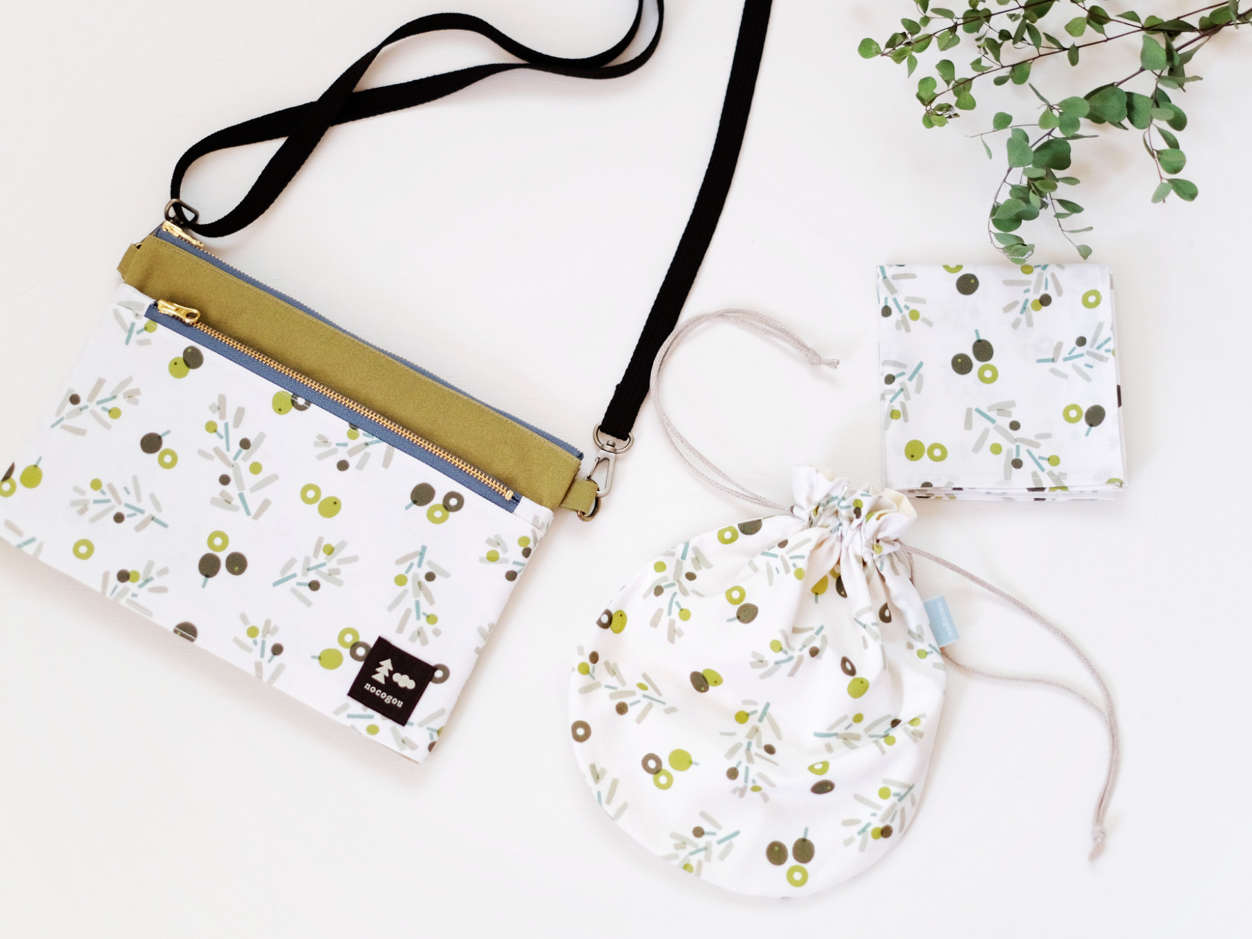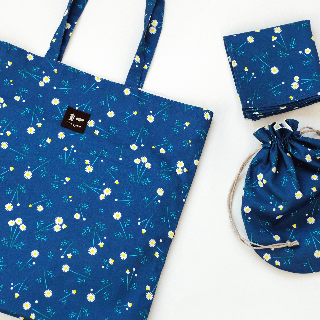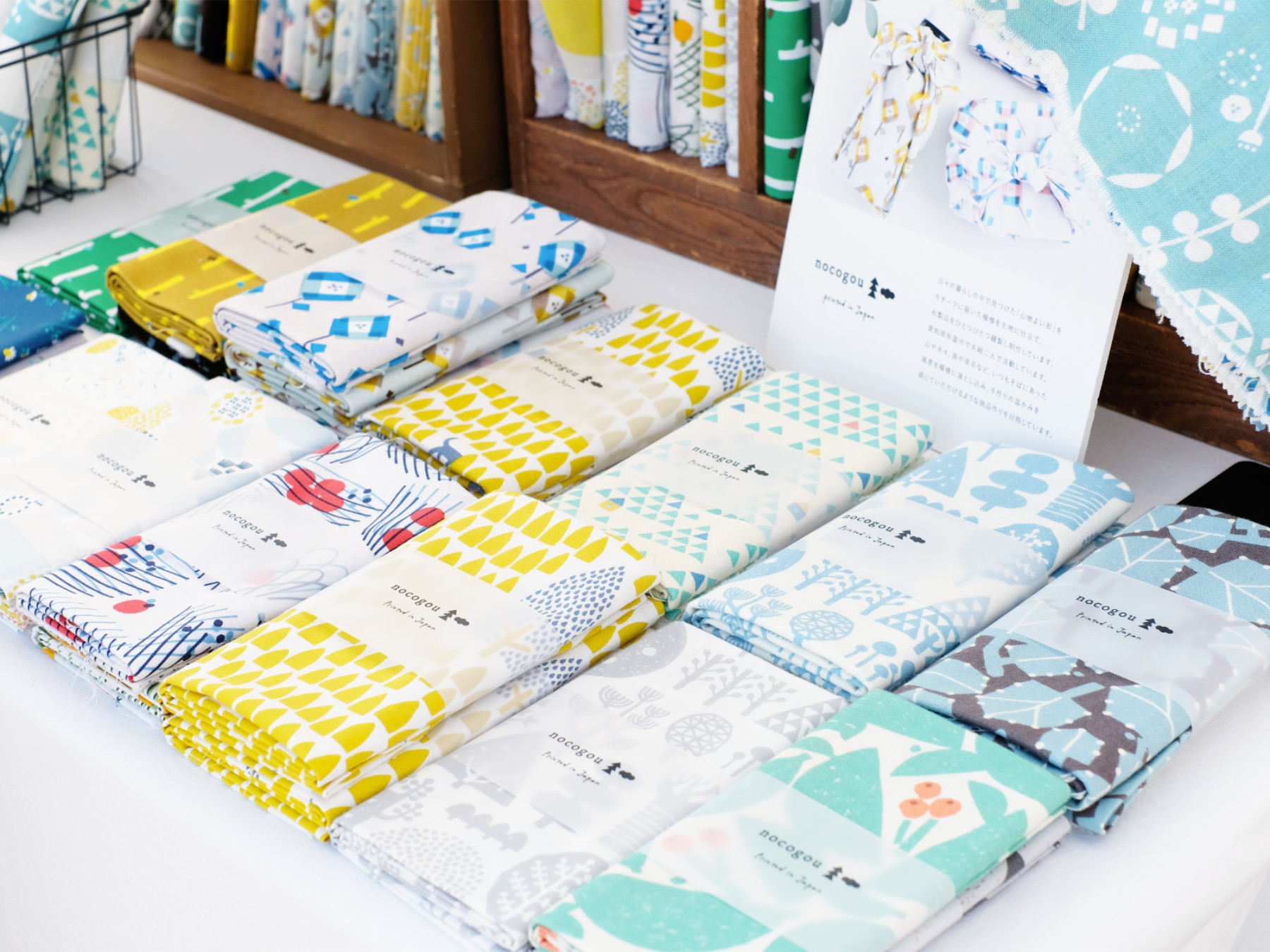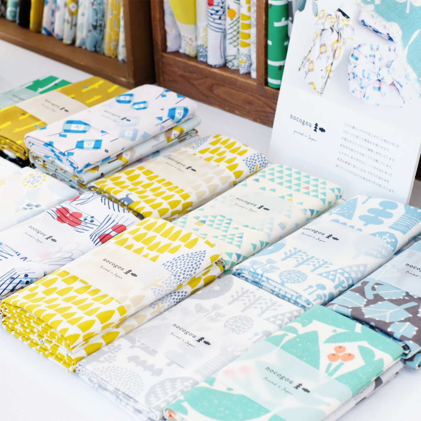 「nocogou(ノコゴウ)」は、夫がテキスタイルデザインを手がけ、国内の染工場で仕立てた布を、妻が手作業で一つひとつ縫製して布製品に仕上げる、夫婦二人のブランド。山なみや木々、朝つゆや石垣、レモンやハーブなど、毎年夫婦で田植えや稲刈りに訪れるふるさとの里山や、日々の暮らしの中で見つけた「心地よい形」を大切にしながら、模様をつくり出しています。出来上がった柄を目にしたときに浮かんでくる、「これをつくりたい!」というワクワク感を大切にしているといいます。ハンカチや巾着、手提げバッグなどのほか、ハンドメイドが楽しめるカット生地の販売も。