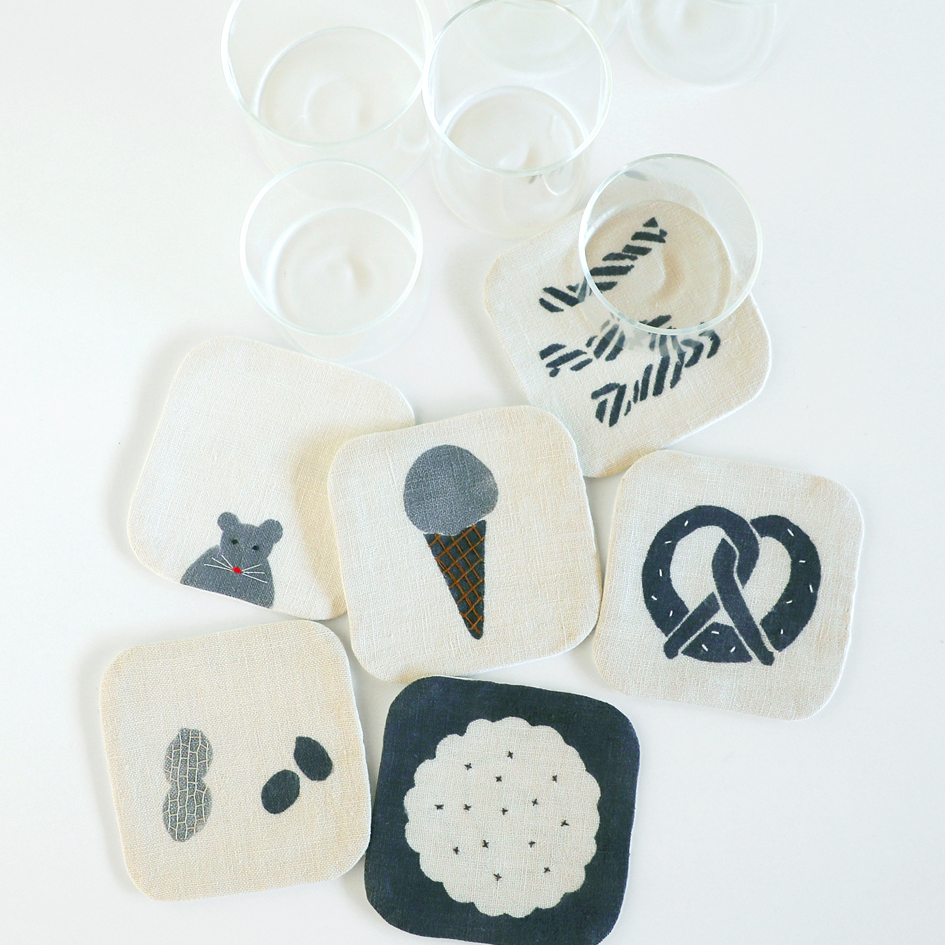 泥染と手刺繍のコースター。トモタケを始めた頃、10cm角の小さなキャンバスに見立てて実験的に作りはじめた作品です。身近なものをモチーフに不定期に新柄を追加して47種類になりました。