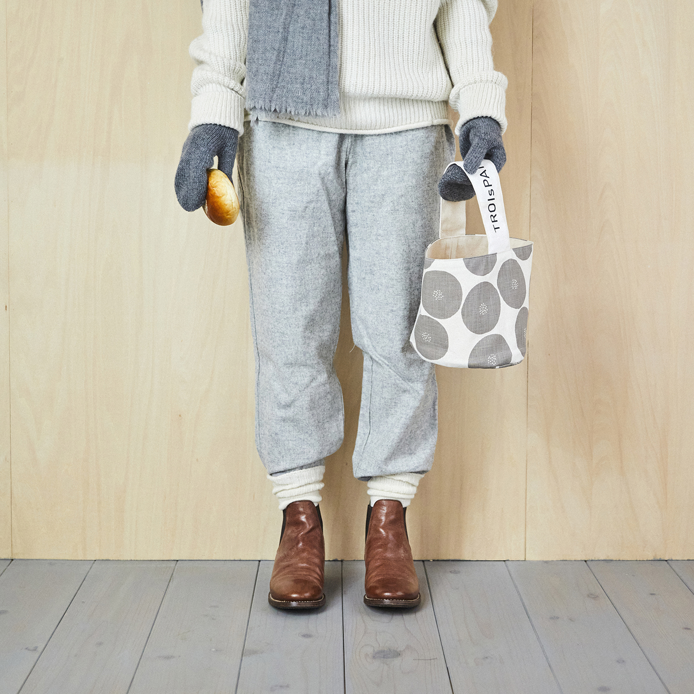 「トロワパンバッグ」あんぱん柄のテキスタイルで作った、あんぱんが3つ入るバケツ型のバッグ。