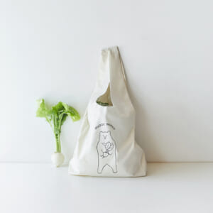 「マルシェバッグ」野菜を持つクマをプリントしたコットン素材のマルシェバッグ。