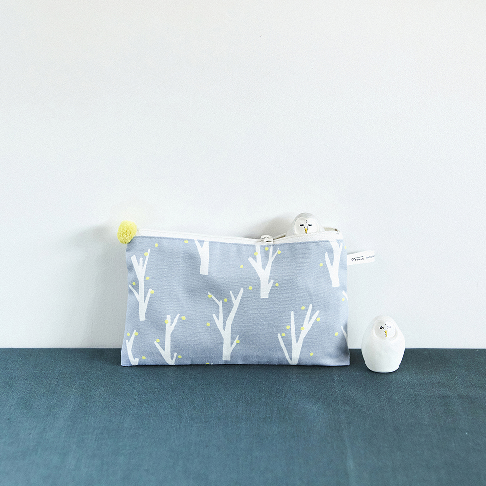 「Tsubomiのポーチ」プリントテキスタイルMUDDY WORKSの蕾柄で作ったポーチ。蕾に合わせたウールアルパカのポンポンをつけました。
