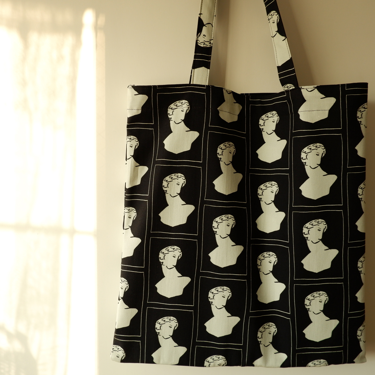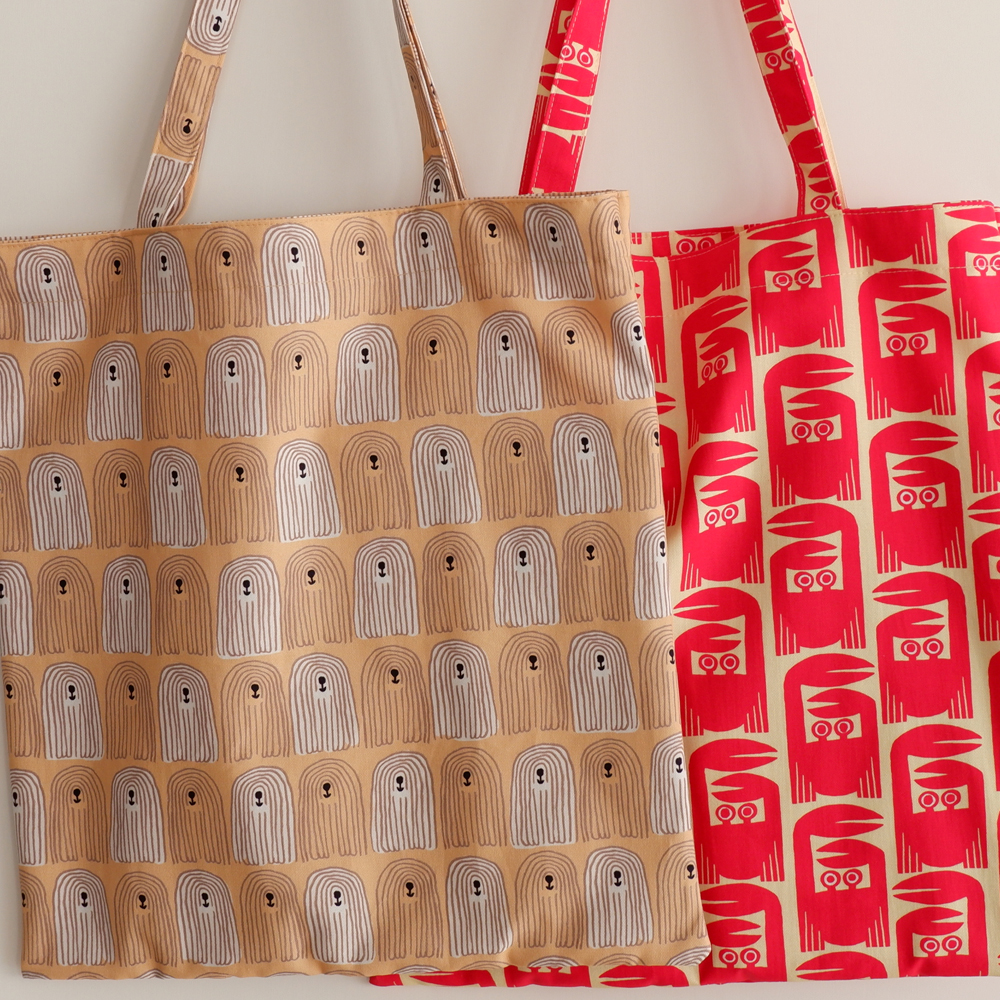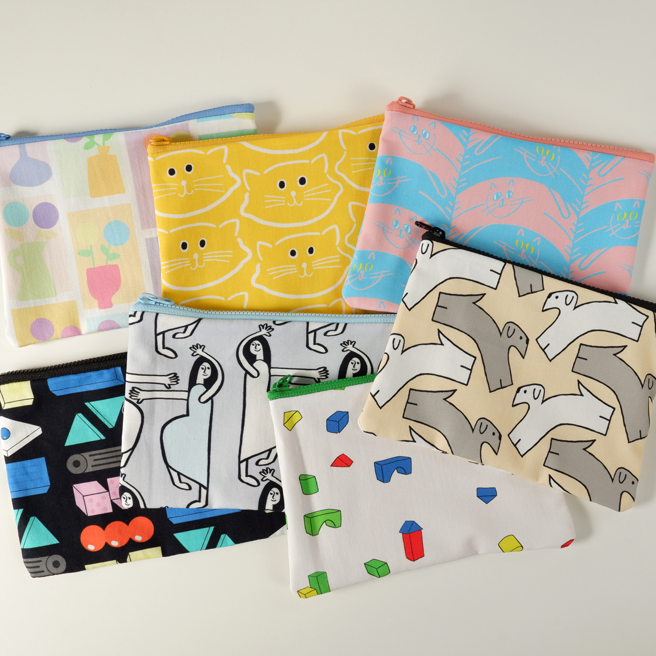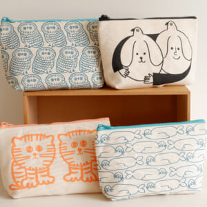 ユニークかつシンプルな絵柄がプリントされた布のポーチやトートバッグです。