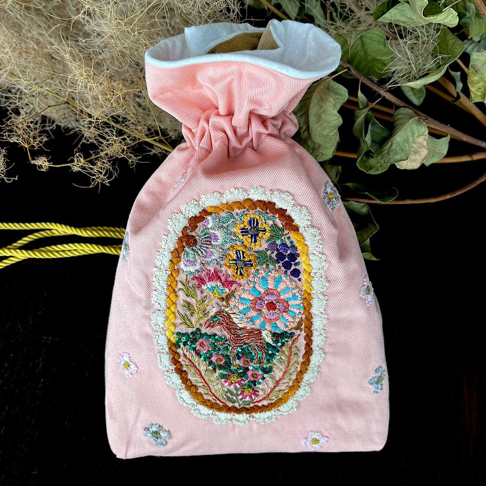 馬や花の刺繍をした巾着バッグです。華やかに可愛いらしくピンク色の布に刺繍をしました。紐部分が長くなっているので、ポシェットのようお使いください。