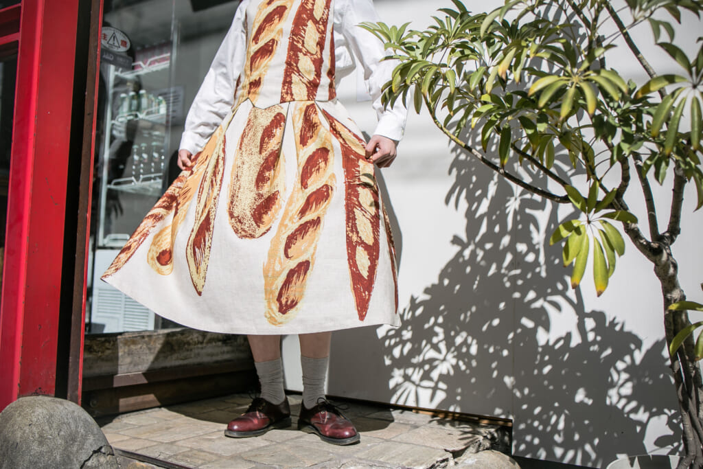 パン屋さんに立ち寄った帰り道のような、パンを抱えて帰るときの安心感と、これから食べる高揚感。ワーク感のある形と、大きなバゲット柄のエプロンワンピースは、食べたい気持ちや、作りたい気持ちをそのまま肯定してくれる一着です。特別じゃなくていいけれど、自分が心地よいと思えるものを選ぶ。そんな「足るを知る」時間が、忙しない現代には必要なのではないかなと思います。