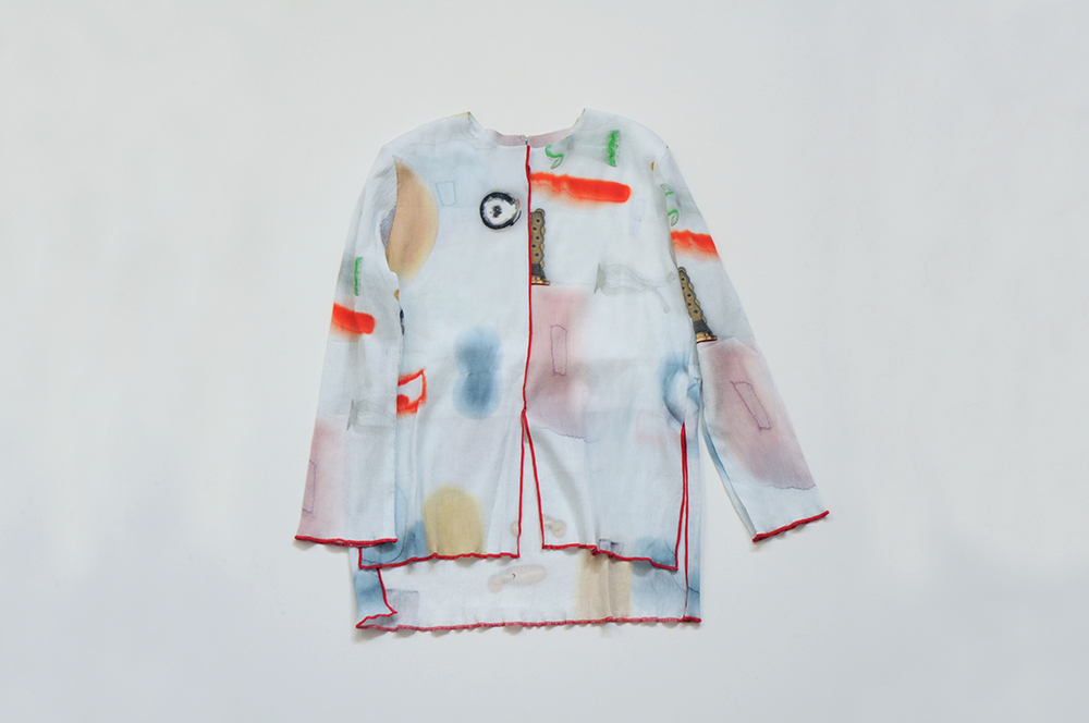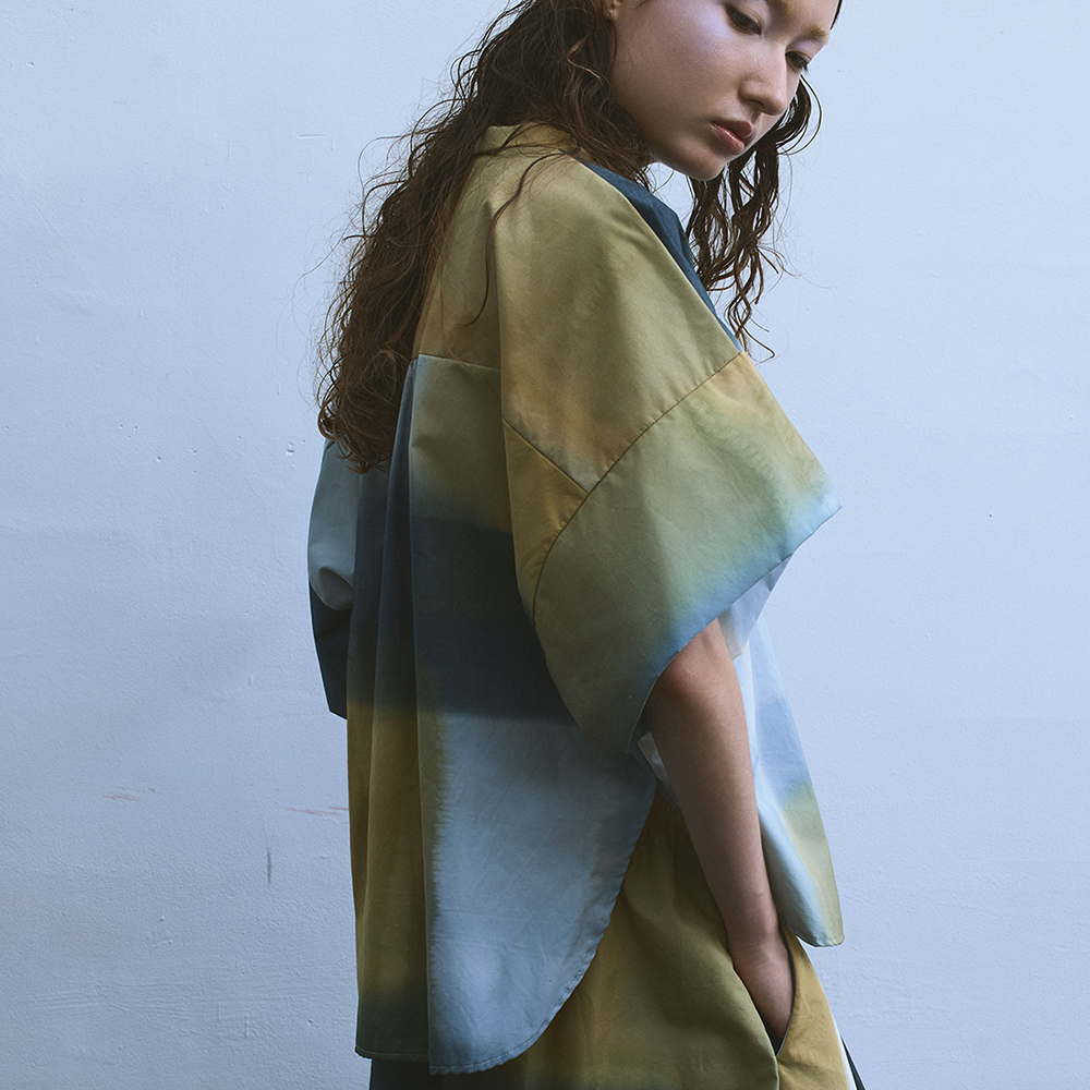 引き染めの生地でつくった洋服。プリントの商品も多いのですが、テキスタイルは手書きや手染めを元に制作しているので、手染めの生地をそのまま使ったアイテムは看板と言えるかもしれません。